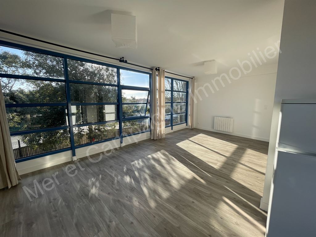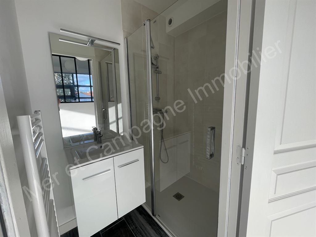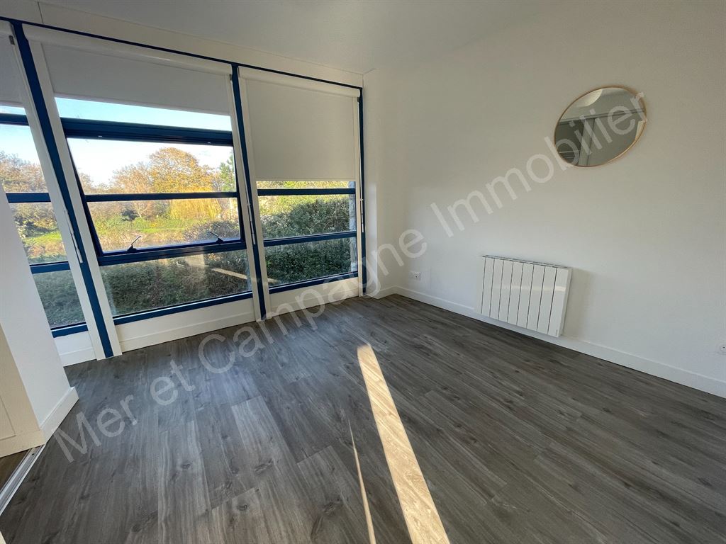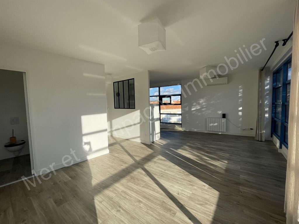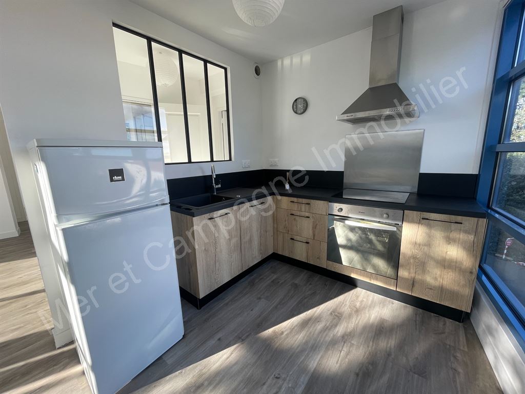 Appartement rénové situé au 1er étage (sans ascenseur) comprenant une entrée, une pièce de vie lumineuse avec une cuisine ouverte aménagée et équipée (hotte, four, plaque de cuisson et frigo).