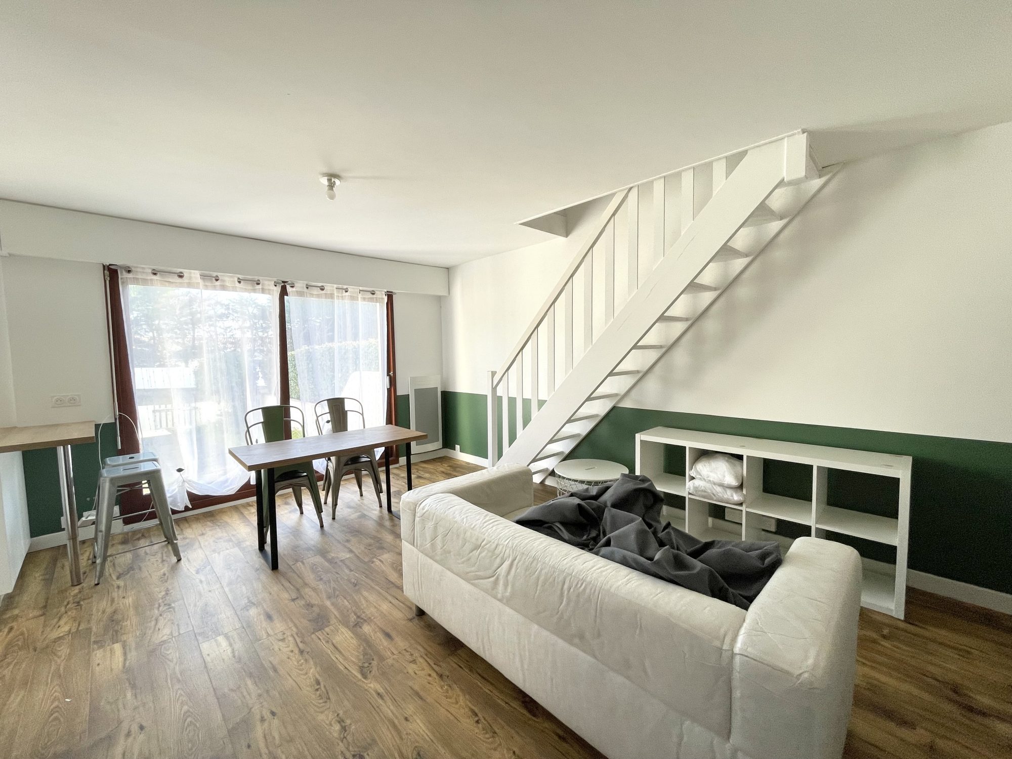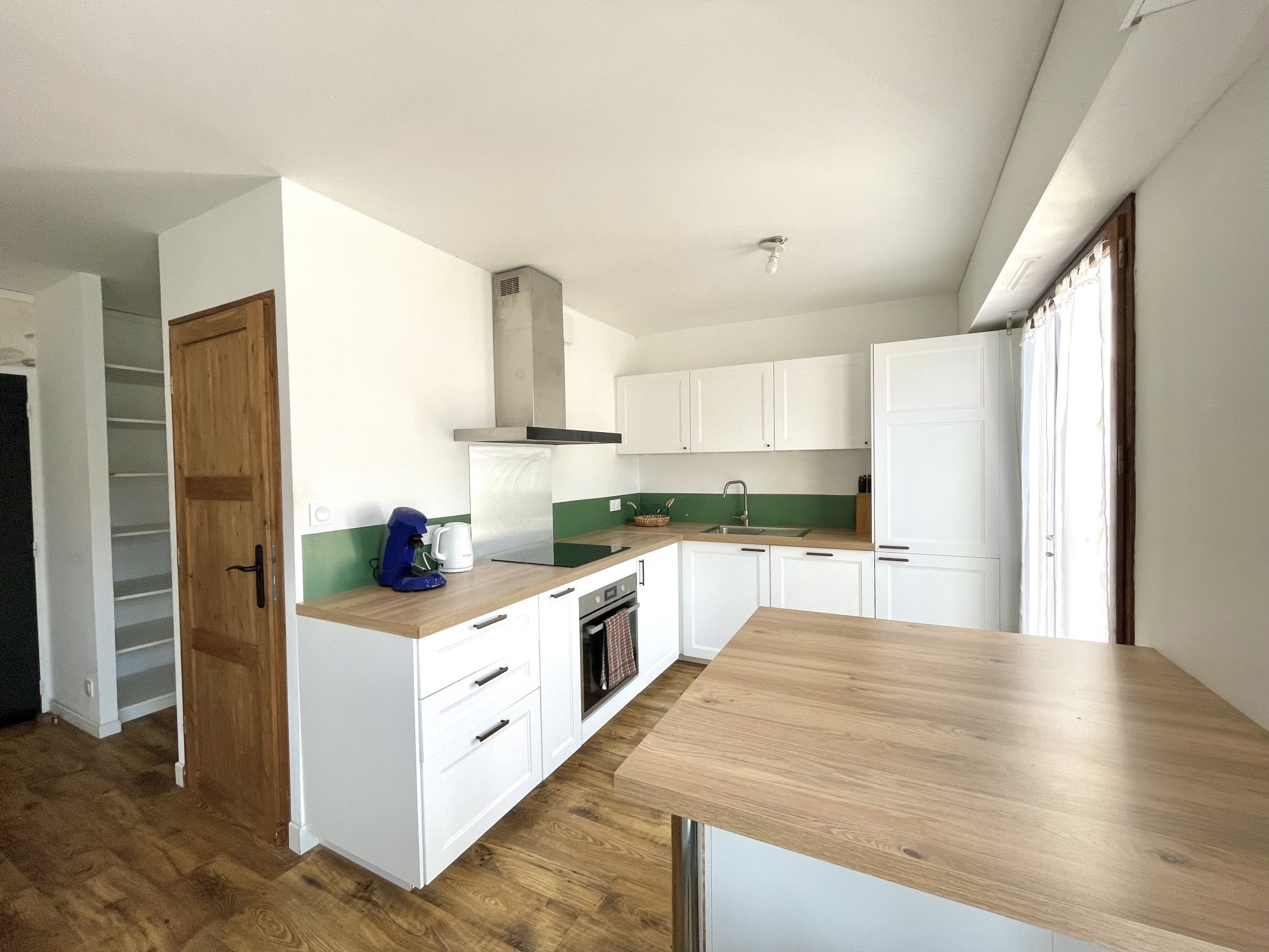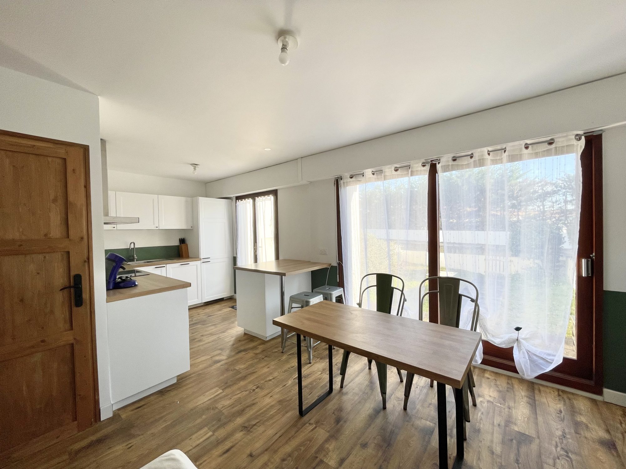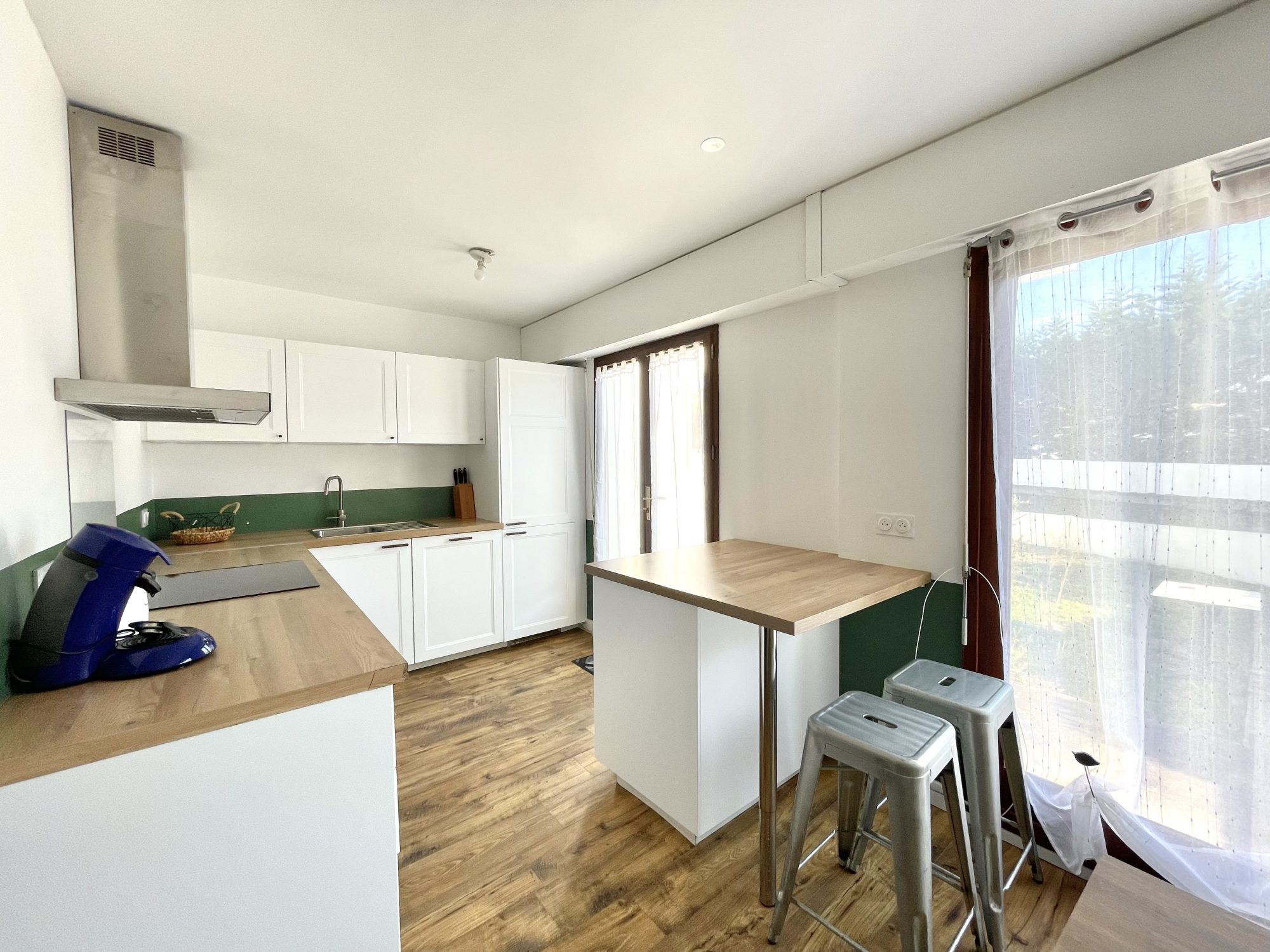 Appartement meublé situé dans une copropriété calme entre le centre-bourg et la mer, comprenant une pièce de vie avec une cuisine aménagée et équipée (plaque induction, four, hotte, lave-vaisselle, et réfrigérateur avec partie congélateur).