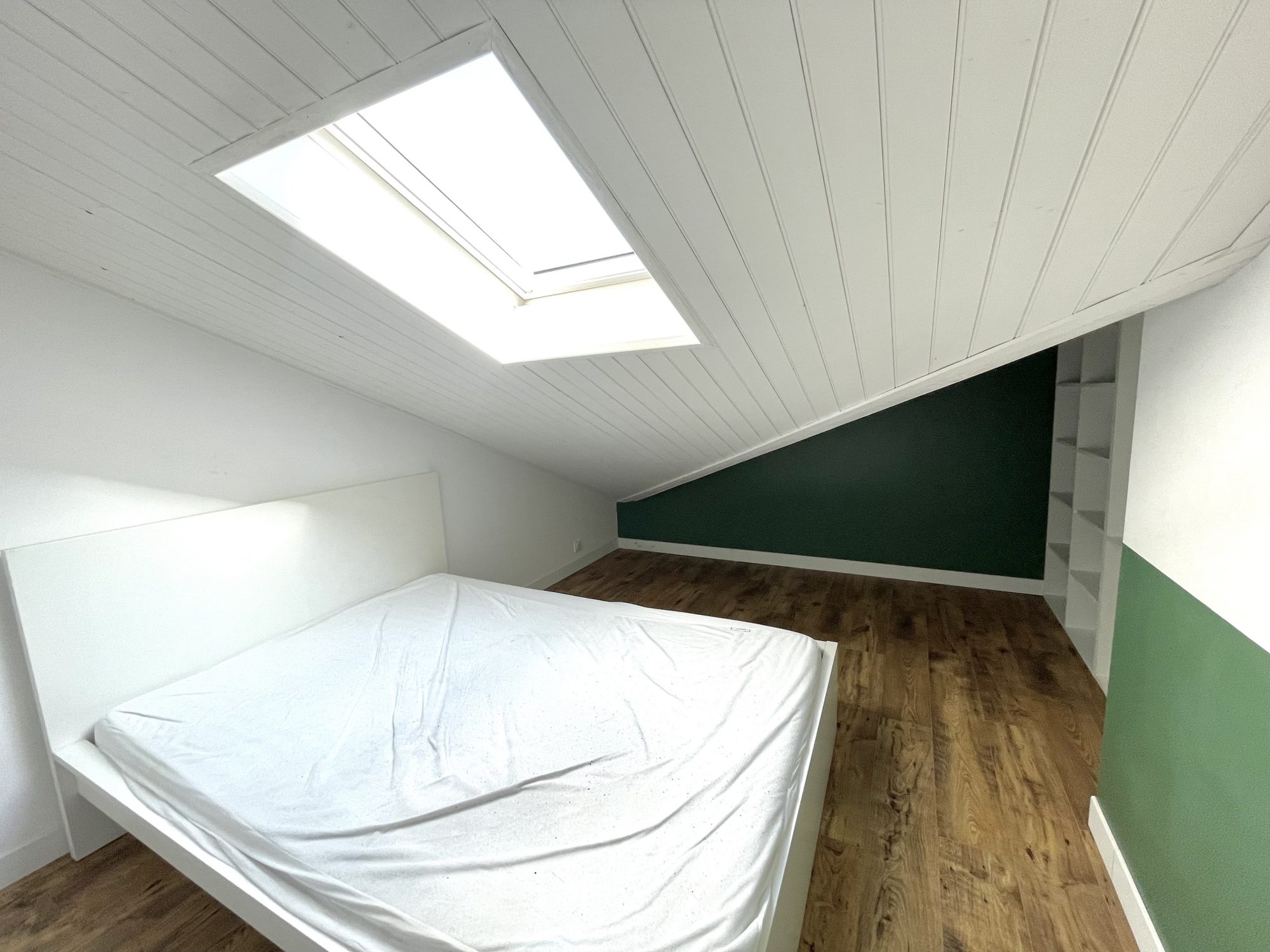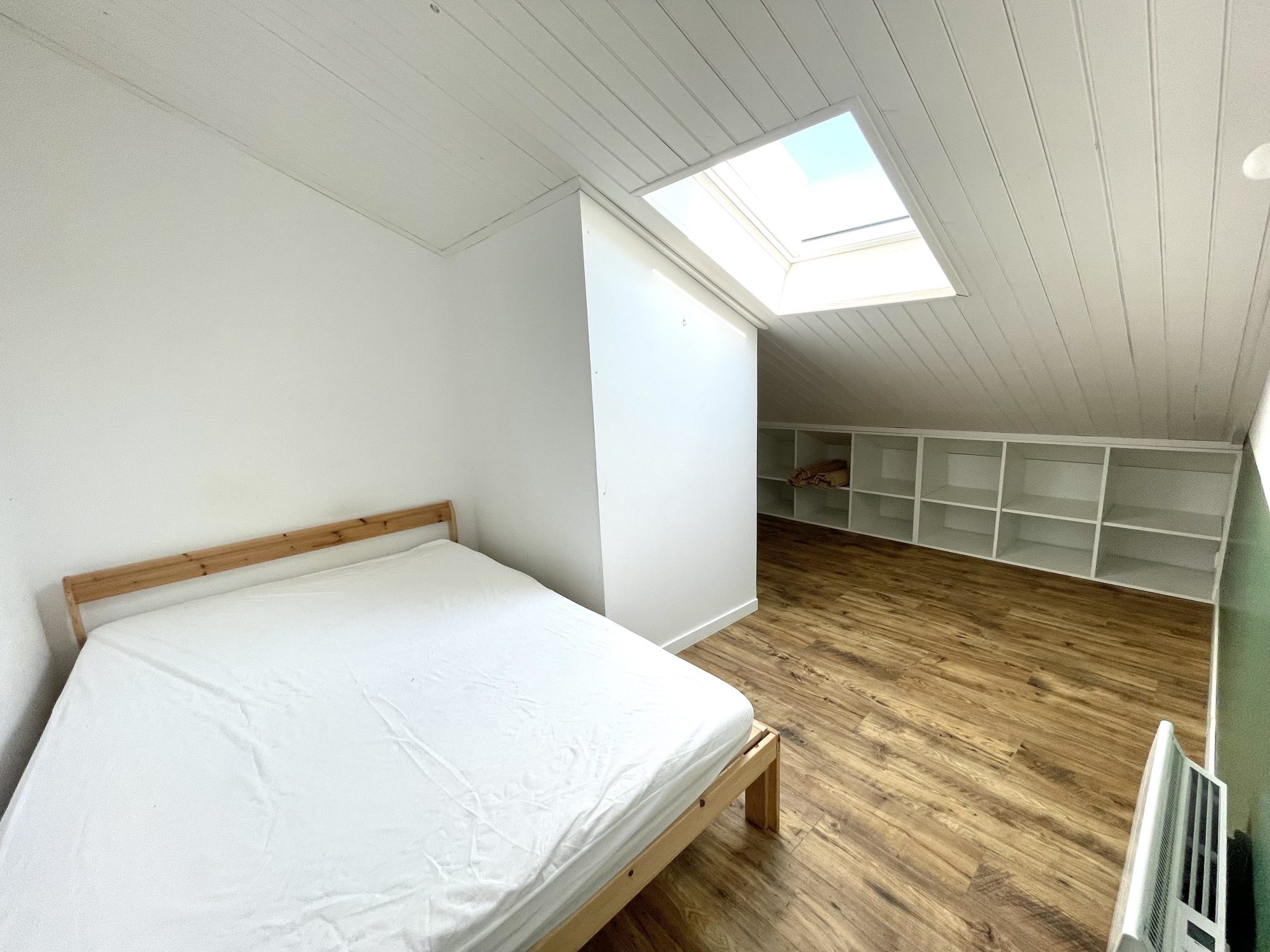 A l’étage, un pallier dessert deux chambres avec rangement. (Chambres sous rampants).
