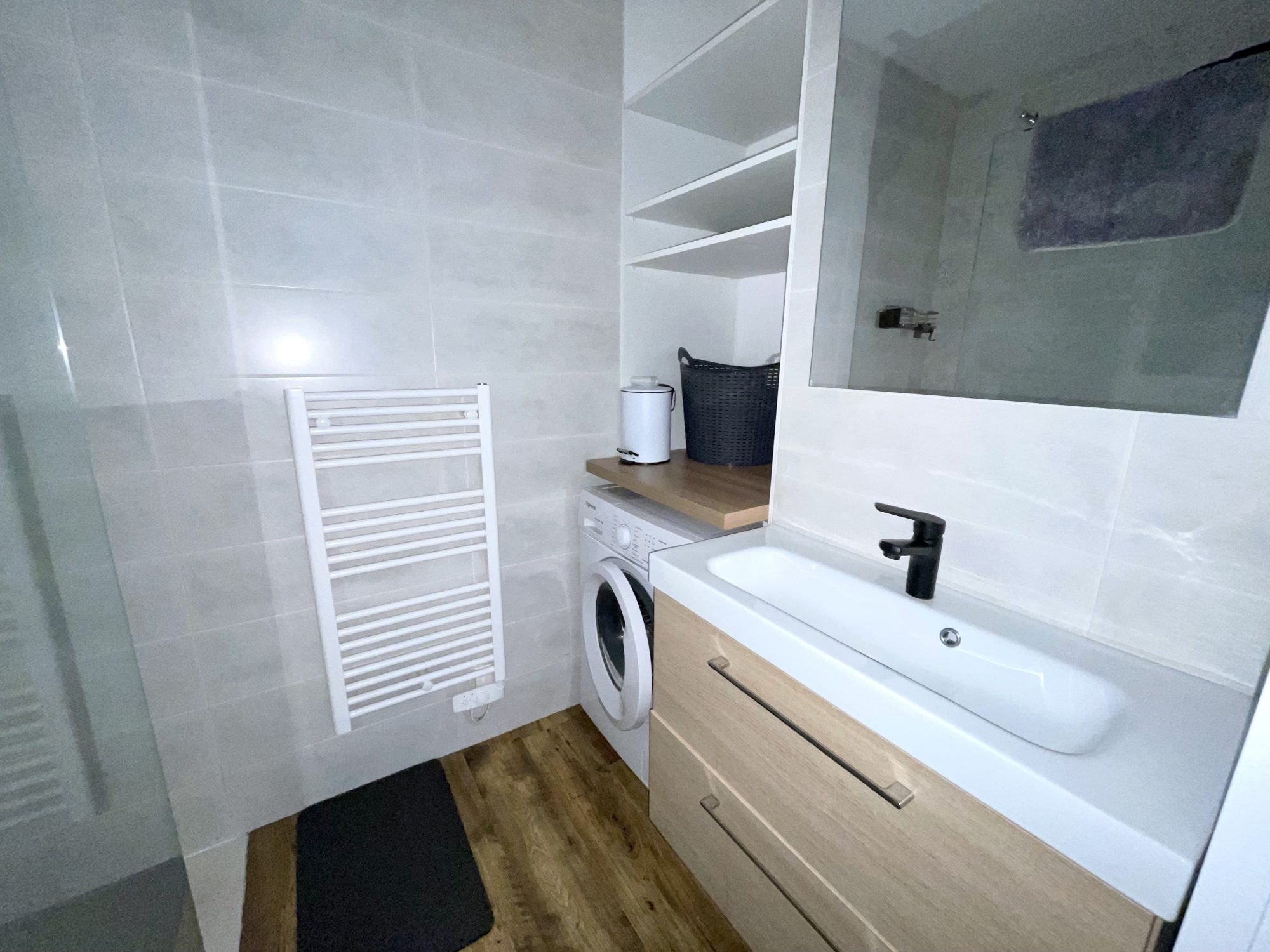 Un dégagement avec rangement, un WC séparé et une salle d’eau (douche et vasque).