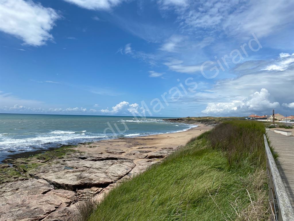 Corniche de Brétignolles sur Mer, à 100 m de l’esplanade du spot de surf et de la plage de la Sauzaie, l’Agence du Marais Girard vous propose cette charmante villa plain-pied T5 pouvant accueillir famille et amis. Sur un jardin de dune de 820 m² : hall d’entrée, séjour/cuisine ouvrant sur terrasse S/O, suite parentale avec sde/wc, 3 chambres, salle d’eau, wc. Garage 32 m². Construction locale traditionnelle, belle clarté. Facile à vivre et située en 2ème ligne. Laissez-vous charmer par ce bel environnement balnéaire et calme.