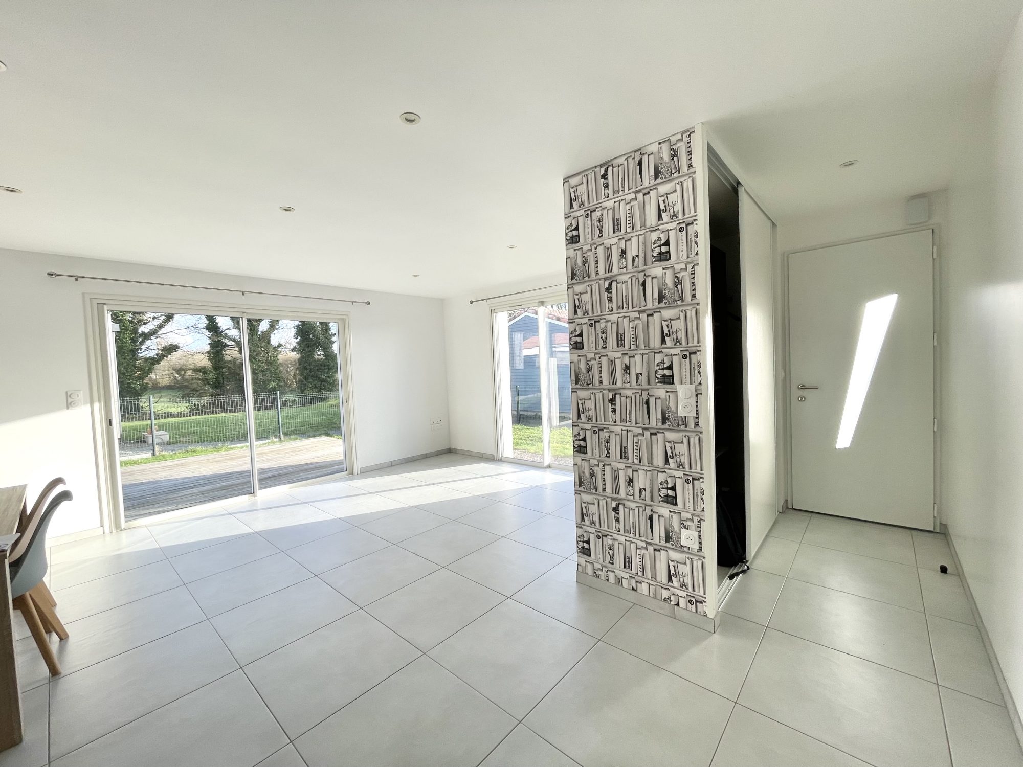 La pièce de vie ouvre sur le jardin avec terrasse en bois.