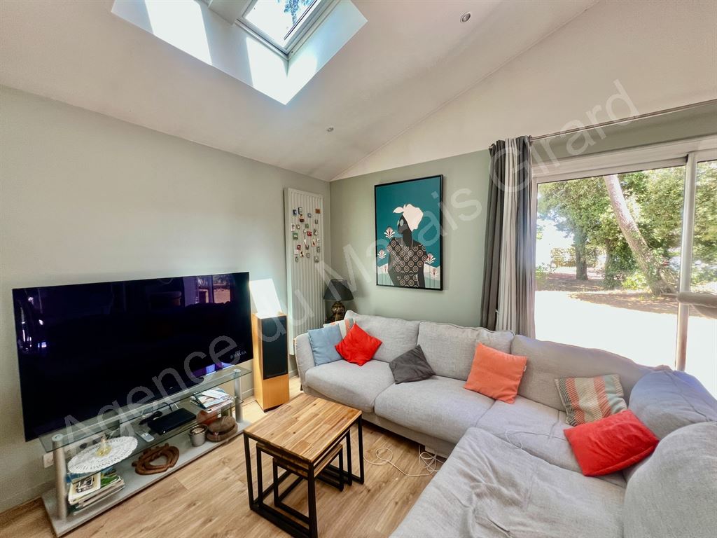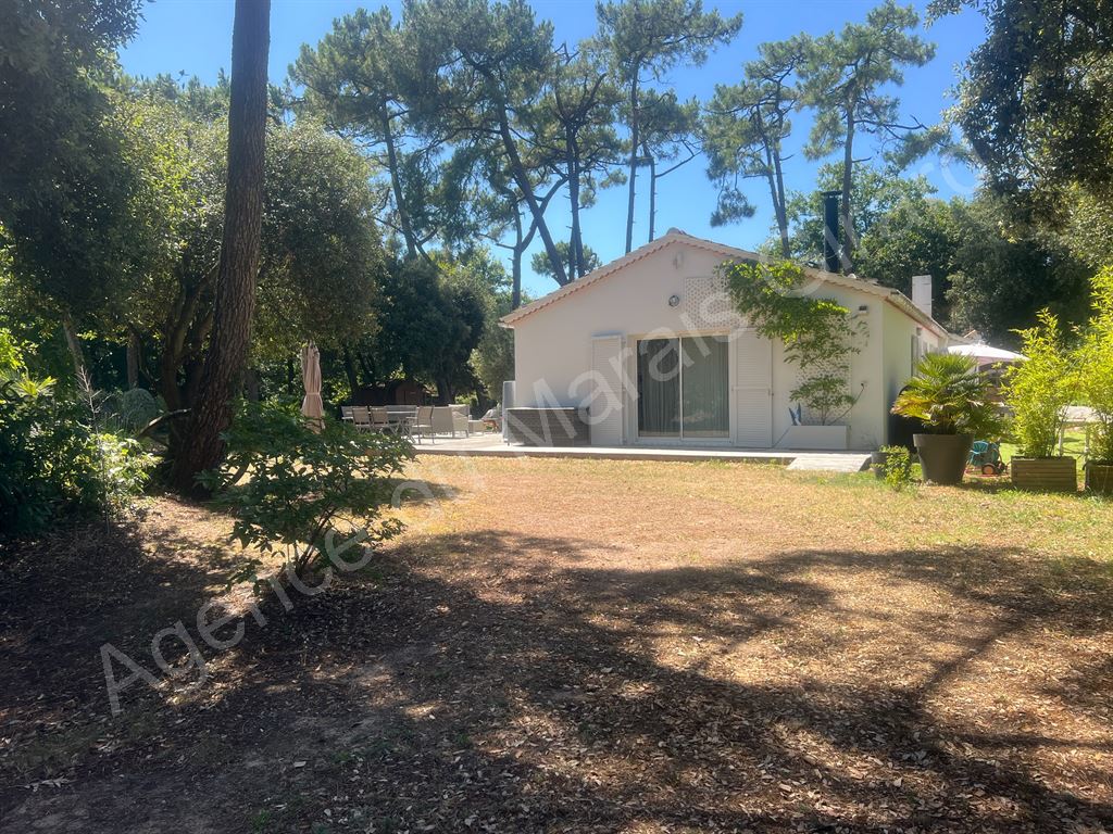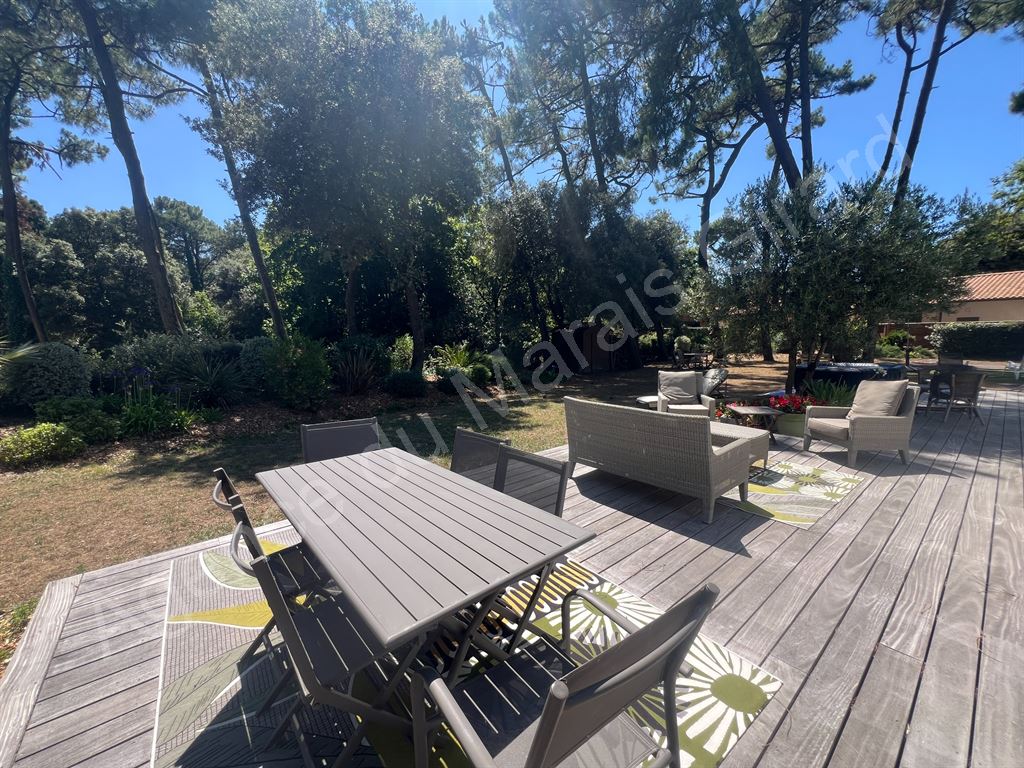 Quartier des Dunes à Brétignolles sur Mer, l’Agence du Marais Girard vous présente cette villa lovée au coeur d’une pinède de 1419 m², à 800 m de la plage des Dunes. Elle offre confort et clarté de plain-pied : séjour ouvrant sur vaste terrasse bois plein sud, cuisine aménagée et équipée, 3 chambres, salle d’eau et wc. Garage attenant. Rénovation professionnelle récente. Le jardin aux multiples essences et calme, ne manquera pas de vous charmer. Visites sur rendez-vous.